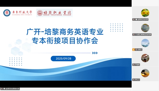 为推动广东开放大学与培黎职业学院深度合作,国际学院于9月28日上午在腾讯会议系统召开培黎职业学院应用英语专业与我校开放教育本科商务英语专业专本衔接一体化人才培养项目协作会。我院副院长(主持行政工作)罗红卫、办公室负责人和本科专业负责人,培黎职业学院继续教育学院院长王雪萍、文化旅游学院院长王作亮携该院英语教师,以及广东理工职业学院南海校区英语教师代表出席了会议。