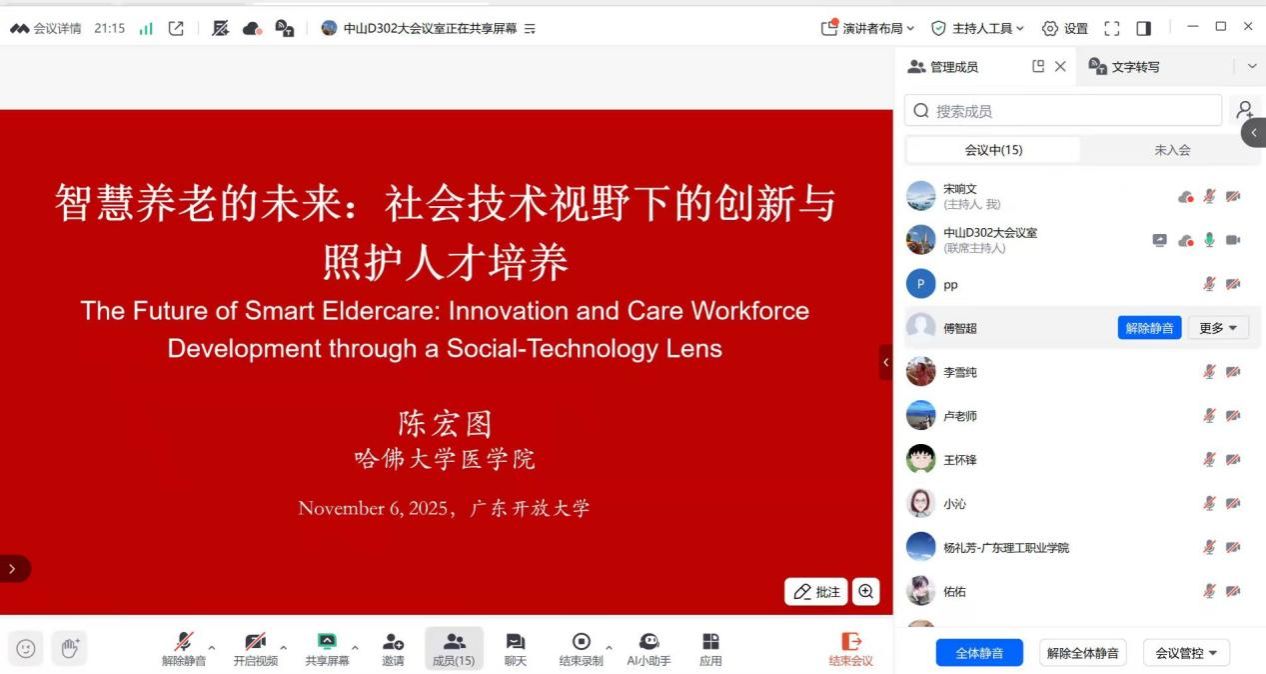 为加强国际合作,深化学校智慧养老领域学术交流,助力省级重点学科老年学高质量发展,11 月 6 日下午,国际学院、社会工作学院、健康产业学院联合举办线上、线下专家报告会,特邀哈佛大学医学院陈宏图教授主讲题为 “智慧养老的未来:社会技术视野下的创新与照护人才培养”的学术报告。国际学院、社会工作学院、健康产业学院领导班子及全体教职工参加了报告会。线下报告会由国际学院副院长罗红卫(主持行政工作)主持。