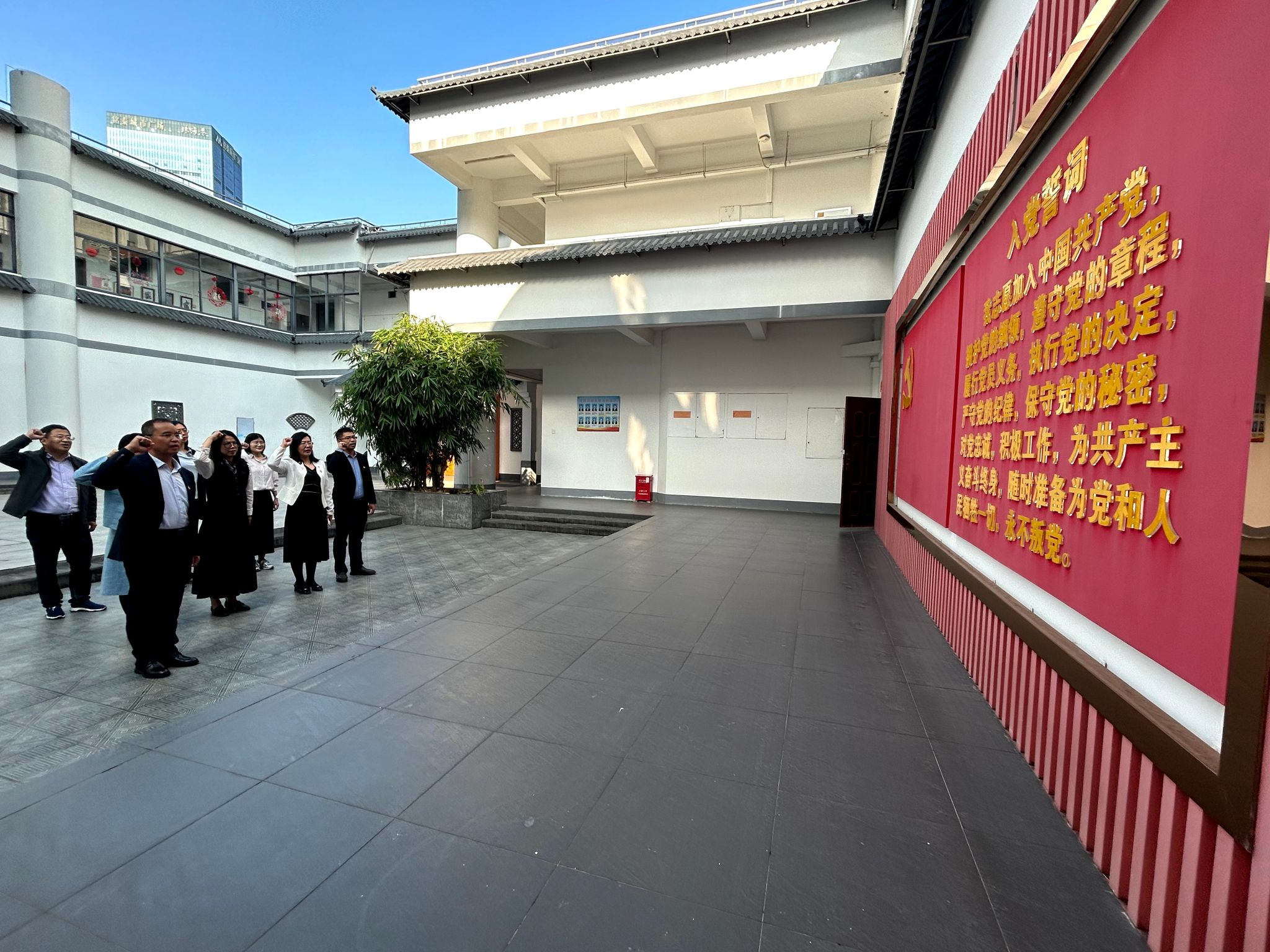 活动伊始,双方共同参观了珠海开放大学“珠海市党员活动天地”。作为市级党员教育示范阵地,该活动天地设有党建文化长廊、初心书屋、多功能研讨室等区域,通过图文展陈、互动体验等形式系统呈现党建成果,还配备专业心理疏导设备,为党员及学员提供多元化服务,成为党建与育人服务融合的重要载体。参观过程中,全体党员在鲜红的党旗下庄严列队,高举右拳重温入党誓词,铮铮誓言彰显着不忘初心、牢记使命的坚定信念。随后,一行人漫步珠海开放大学校园,实地感受其办学环境与文化氛围。