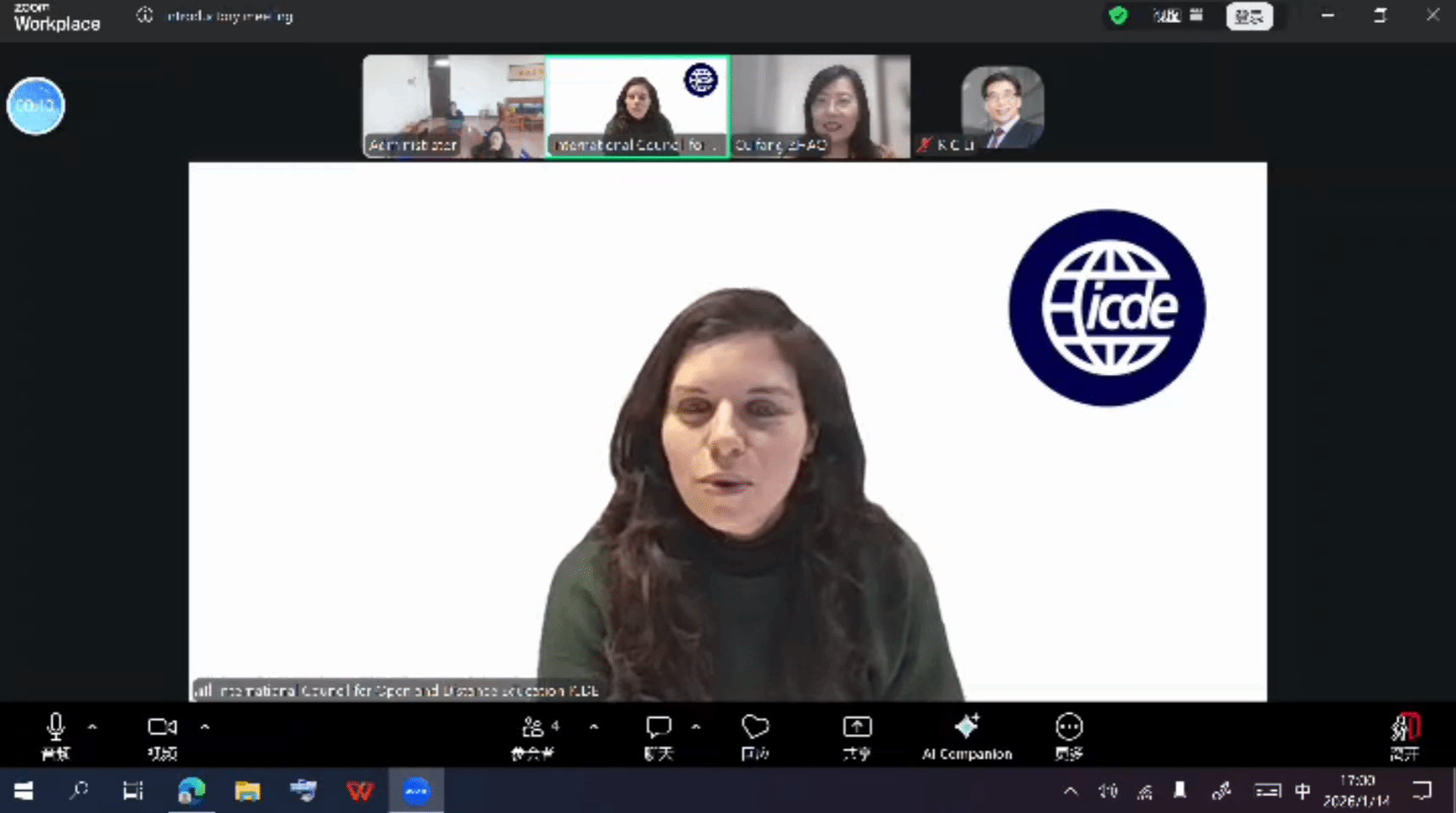 会议伊始,Sophia Javaid女士代表ICDE对我校正式加入协会表示热烈欢迎。国际开放与远程教育协会(ICDE)成立于1938年,是全球开放与远程教育领域历史最悠久的非政府组织,也是联合国教科文组织的咨询伙伴。其总部设在挪威奥斯陆,核心使命是推动全球包容、公平的优质教育。她详细介绍了我校作为正式会员可享有的核心权益与支持,包括全球开放教育网络接入、专业发展资源、国际会议参与机会及研究合作平台等,并现场解答了学院代表关于如何充分利用会员资格促进发展的相关问题。