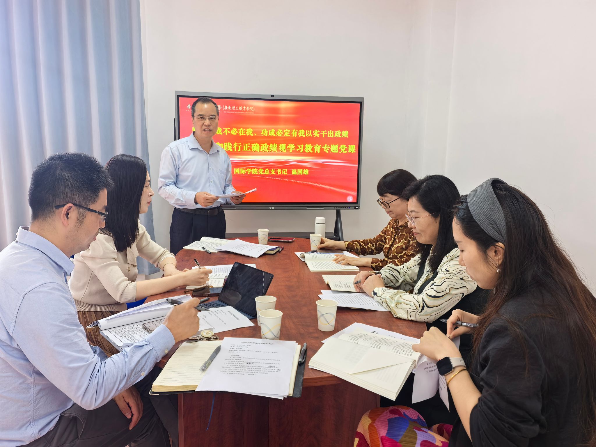 温国雄号召全体党员,要以此次学习为契机,进一步增强政治自觉、思想自觉和行动自觉,把树立和践行正确政绩观落实到推动学院“双高”任务验收、办学能力评价、国际交流等重点工作中,以实实在在的业绩交出无愧于组织、无愧于师生的时代答卷。