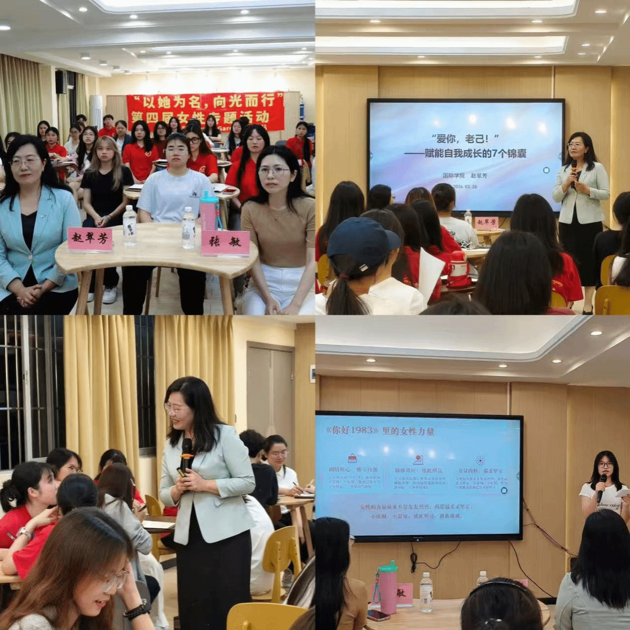 赵翠芳以网络热词“爱你,老己!”为引,通过趣味互动与个人经历分享开启成长话题。现场先后开展了词语接龙、“我的缺点,你的优点”等互动游戏,引导同学们直面自我、增强自信。她结合自身从自卑到自信的成长经历,讲述了学历提升、突破职场瓶颈的奋斗故事,送上自尊、自信、自强三大成长“锦囊”;同时提出自知、自愈、自燃的女性成长“三部曲”,为同学们指明认知自我、疗愈自我、点燃热爱的成长路径,鼓励大家接纳不完美,实现内心自洽与人生自由,成为独立而有力量的新时代女性。