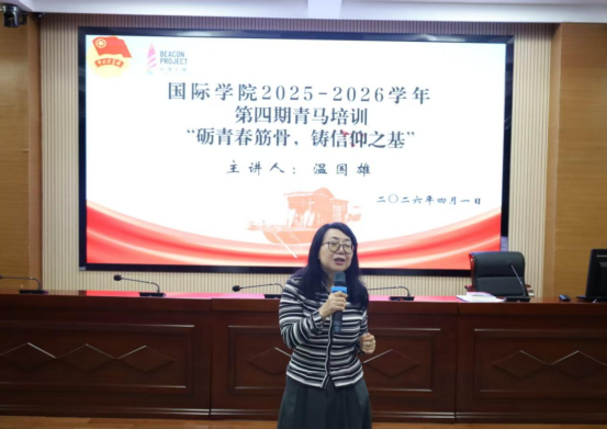 4月1日,国际学院2025-2026学年度“淬炼党性守初心,青年建功新征程”青马工程第四期培训在学术报告厅顺利举行。学院党总支书记温国雄担任主讲人,学院党总支副书记、副院长(主持行政工作)罗红卫,学院团委书记龙信、心灵驿站站长张敏及全体学员参加本次培训。