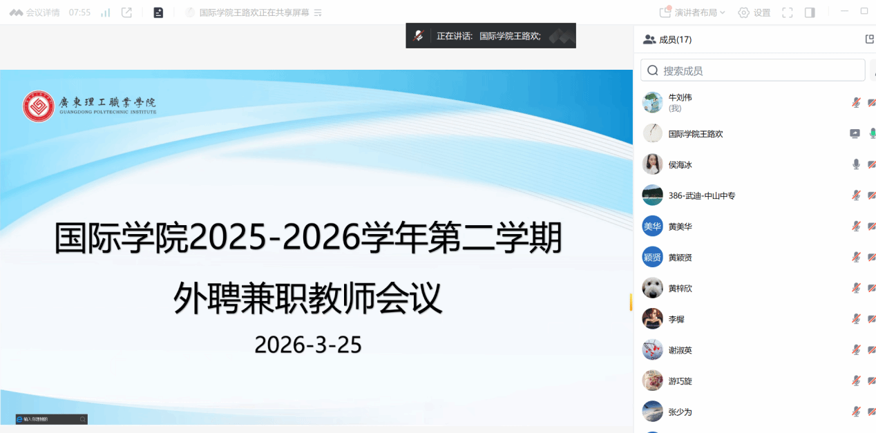 为提升外聘兼职教师教学水平,规范教学管理,2026年3月25日,国际学院组织了一场外聘兼职教师线上培训会。学院副院长侯海冰、团队负责人牛刘伟、谢淑英、周少华、教务员王路欢以及全体外聘兼职教师齐聚云端,共同参与学习。